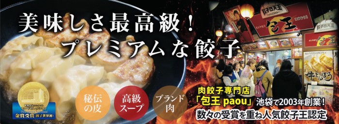 ●「日本一美味しい餃子」を目指して20年以上。 TV取材約200本以上、数多くのメディアに紹介されてきた 肉餃子専門店 「包王Paou(パオウ)」 が、 既存店舗の売上を上積みできるライセンスをご提案します。 ●初期費用48万円~・ロイヤルティゼロ・保証金ゼロ。 ゼロからの開業ではなく、既存店に…