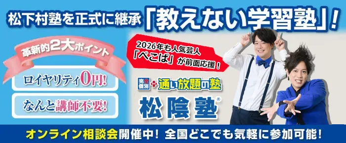 「松陰塾®」は、個別指導塾45年以上の指導経験とノウハウを基に20年以上の歳月をかけて作られた、新スタイルの完全個別指導塾です。 ★注目ポイント★ ①時代に合わせた独自の学習スタイルを確立! ②利益率70%!?同業他社では実現できない高利益経営! ③「自立学習スタイル」が今後のトレンド? …