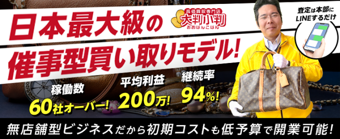 店舗取得不要で買い取った瞬間に利益確定するから安心! 高額販売は本部にお任せできるから未経験でもスタートができる! 全国に出店できる無店舗型ビジネス! 高価買取専門店の『大判小判』は、低コスト&高収益の事業です。 鑑定はプロが行うため、オーナーは写真を撮ってLINEで送るだけでOK。 特別な知識や…