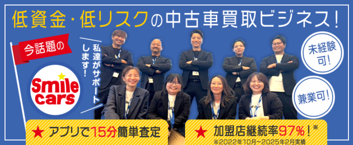「ハッピーカーズ」は2016年のFC開始から7年で、 全国に110店舗以上となった ・無店舗 ・無在庫 で開業可能な中古車買取のフランチャイズです! 110店舗の加盟店ネットワークから蓄積された成功と失敗のノウハウにいつでもアクセスできます。 そのノウハウを通して年々「ハッピーカーズ」加盟店オーナ…