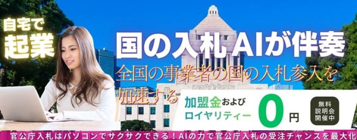 景気に左右されない『国の仕事』を、AIがあなたのビジネスにつなげます。 もう、資格勉強も、店舗投資もいりません! 一人でも、自宅から『信頼の取引』を始められる時代へ。 「AI × 官公庁入札」――それは、国とつながる新しいビジネスモデル。 入札資格は―― 試験なし!書類申請だけで、最短2週間で…