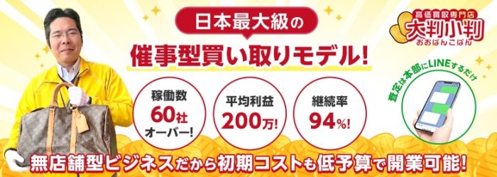 店舗取得不要で買い取った瞬間に利益確定するから安心! 高額販売は本部にお任せできるから未経験でもスタートができる! 全国に出店できる無店舗型ビジネス! 高価買取専門店の『大判小判』は、低コスト&高収益の事業です。 鑑定はプロが行うため、オーナーは写真を撮ってLINEで送るだけでOK。 特別な知識や…