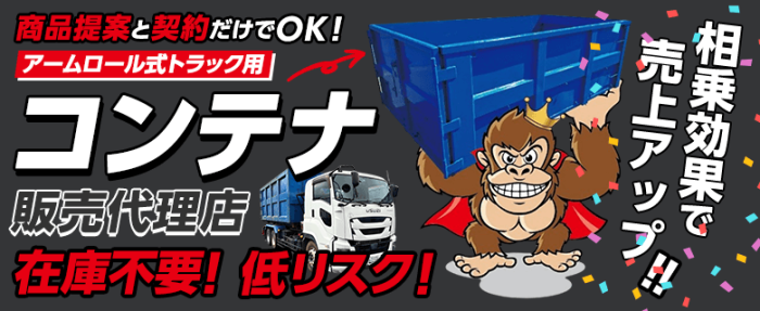 アームロール(フックロール)式トラックに対応した、『脱着コンテナ』を販売するビジネスモデルです。 加盟店様は、トラック販売時にコンテナをセットで提案・受注し、受注後は本部へ発注するだけ! 商品供給からコンテナのカスタマイズ対応、販売ノウハウ提供まで、本部が担います。 トラックを取り扱う中古車販売…