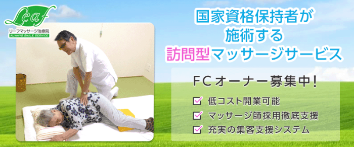「リーフマッサージ治療院」は健康保険が使える訪問型のマッサージです。 ご自宅で保険が使えるので利用者の負担はごくわずかですみ、解約率が低く利益率が高いビジネスです。 また国家資格を持つマッサージ師を雇用して運営しますのでオーナー様は無資格でのスタートが可能です。 従業員マネジメントや集客、運営をメ…