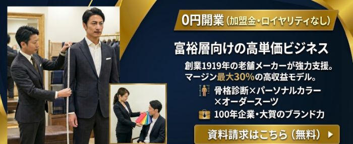 創業107年・全国47店舗を展開する大賀株式会社が提供する、オーダースーツ × スタイリング × イメージコンサルのトータルプロデュースサービスを、ご自身のネットワークへ紹介していただく 販売代理店制度 です。 ★大賀の特徴をご紹介! ・会社員の副業・個人事業主のサイドビジネスとして開業可能 ・…