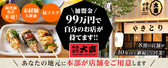 2023年1月に「やきとり大吉」は、「株式会エターナルホスピタリティグループ(旧鳥貴族ホールディングス)」のグループなり、更なる強力なサポートで成功に導きます。 わずか99万円でお店が持て、3ヵ月間、繁盛店で学ぶ独自のOJT研修システムで、飲食店未経験者も一人前の『やきとり大吉』の店主に育てます。 …