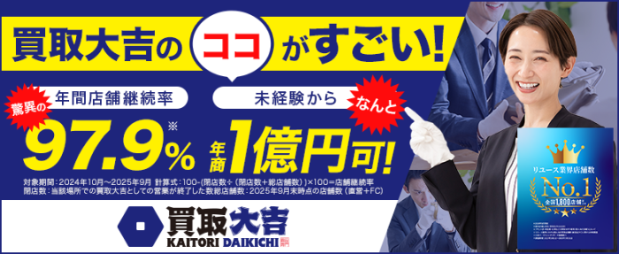 「オーナー様に損をさせない、失敗させない」をモットーに脅威のフランチャイズサポートを展開! 未経験・1人で開業でき、1年目から利益がでる仕組を構築しています。 ★☆「買取大吉」の3大サポート☆★ ~開業初月を徹底サポート~ ■本部SVが常駐し一緒に運営 実務を通して査定ノウハウや集客のコツなどをじ…