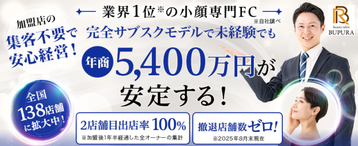 「小顔専門店BUPURA(ブプラ)」(商標権獲得済)は、施術効果をすぐに実感できるエステサロンです。 業界初!独自の『頭蓋骨小顔リフト3TS法』で、高評価の口コミを獲得しています。 2024年8月にTVにて「全国で急拡大中のサロン」として紹介された小顔専門店です! ★★★こんな方におすすめ!★★…