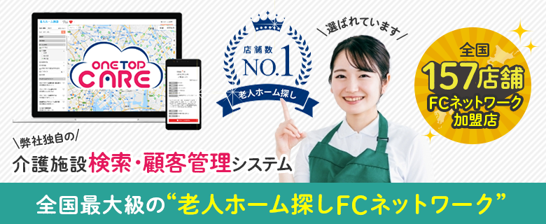 ワントップ老人ホーム紹介パートナーは全国No.1の紹介店舗数を誇り、加盟したその日から老人ホーム検索管理システム「ワントップケア」をご利用頂けます。