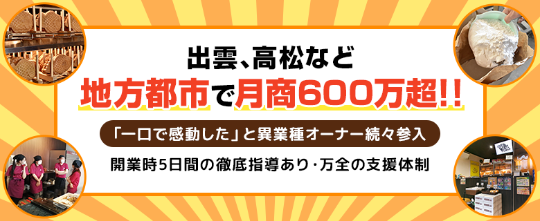 | 業種 | 飲食・菓子業 , サービス業 , 小売業 , スイーツ , 菓子店 , カフェ , 居酒屋・バー , 小売販売 , その他 , 法人おすすめ , 多店舗展開しやすいフランチャイズ , 投資回収の早いフランチャイズ |