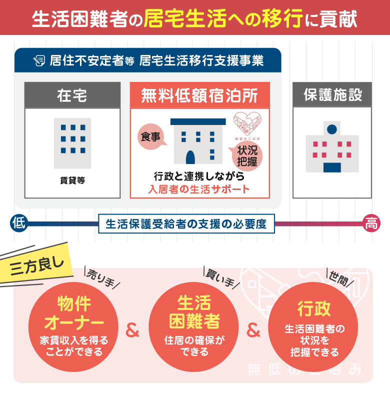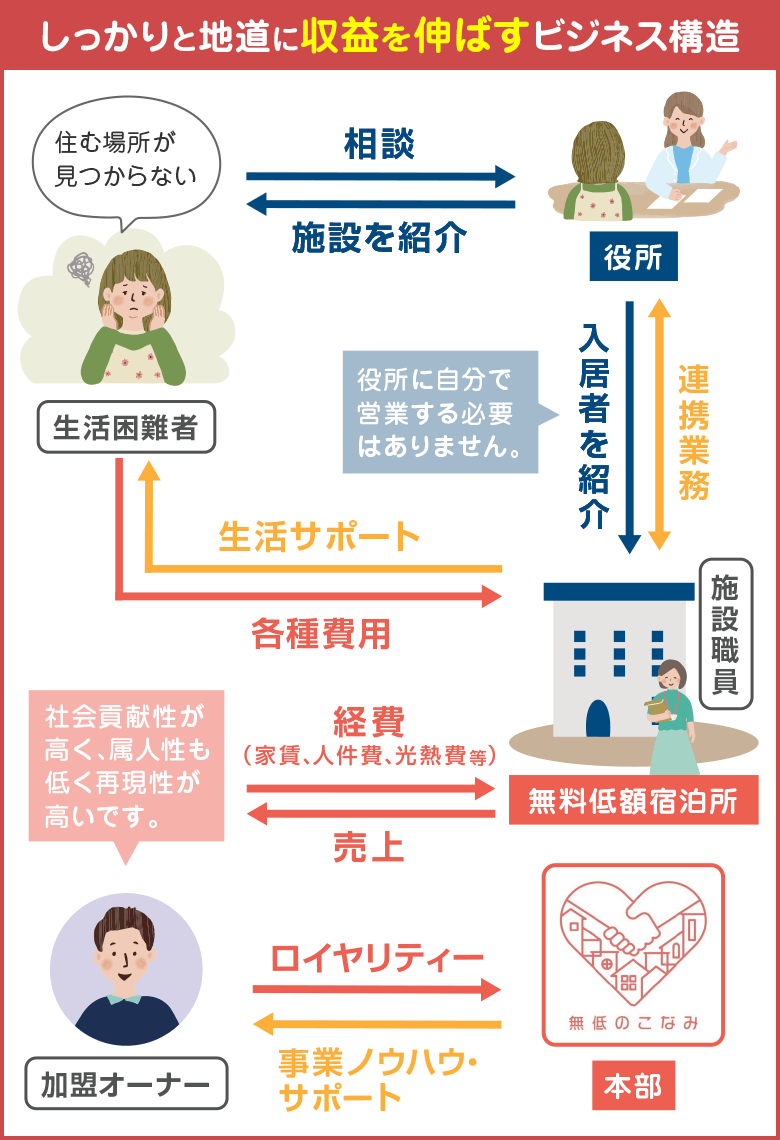 生活保護者は住居の確保ができ、行政は生活困難者の状況を把握でき、FC加盟者(物件オーナー)は家賃収入を得ることができる三方良しなビジネスです。