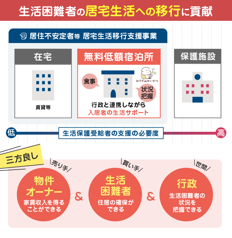 行政連携の「無料低額宿泊所」運営で、安定したストック収益を。