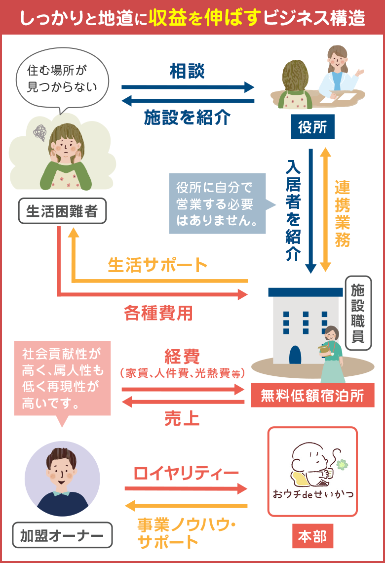 生活困難者の方へ住居を提供するこの事業は、 一般的なアパート経営とは異なり、 **行政(市役所)**から入居者が紹介されるため、 集客や営業活動がほぼ不要です。