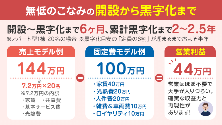 開設~黒字化まで6ヶ月、累計黒字化まで2.5年を想定しております。