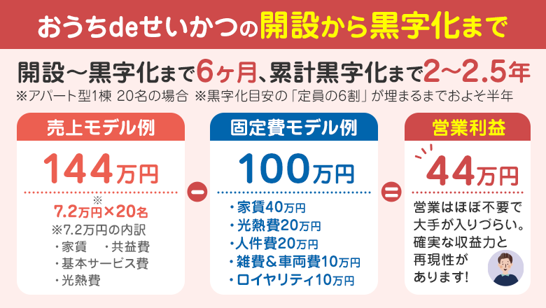 営業利益44万円/月(アパート1棟20名の場合)。 投資回収目安は「2〜2.5年」のスピード回収。