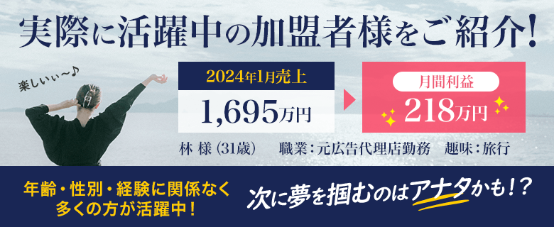 加盟6ヶ月で月収100万円以上の方や数年で月収200万円以上の方も多くいらっしゃいます。