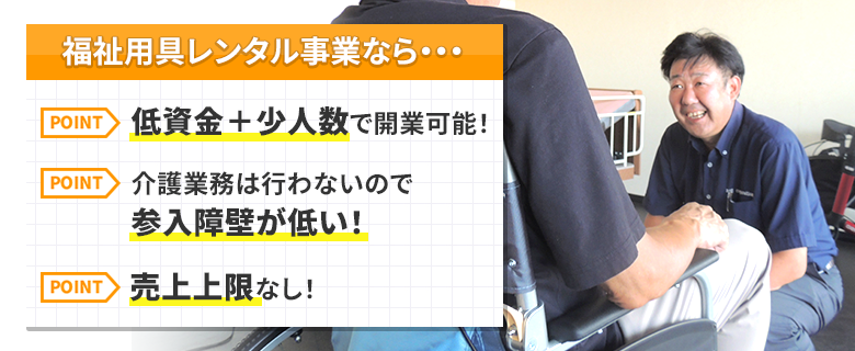 数多くの介護ビジネスがありますが、当社の福祉用具のレンタル事業は比較的低資金でスタートでき、