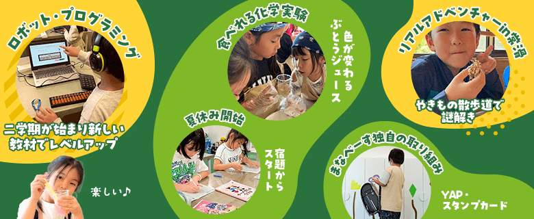 学校の宿題サポートをはじめ、基礎学力向上、掃除や読書などの習慣づくり、あそびを通じた学びの発見など、10を超える多彩なコンテンツをご用意しています。