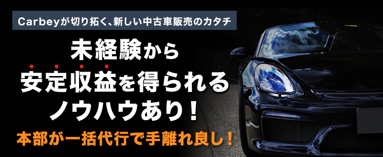 「Carbey(カーべイ)自動売買システム」は、【在庫ゼロ】【無店舗】【本部が売買代行】で始められる新しい中古車フランチャイズです。