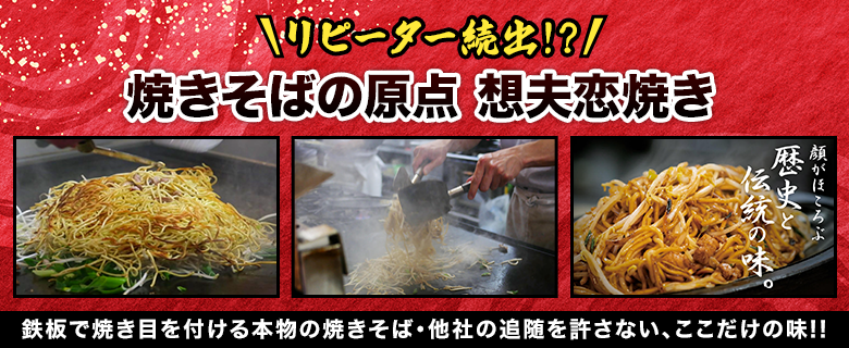 また今では、様々な種類の焼きそばが存在していますが、様々な焼きそばのルーツを辿ると「想夫恋焼き」に行き着くものと当社は自負しております!