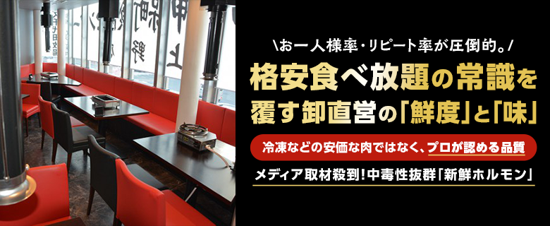 従来の「格安食べ放題」とは一線を画す、 プロが認める「本格的な肉(新鮮ホルモン・精肉)」を 45分一本勝負で提供する。