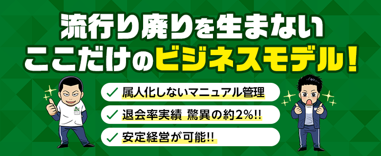 | 開業資金 | 600~900万円 ※エリア・物件をご自身で選ぶことも可能です。 ※詳細はお問い合わせください。 |