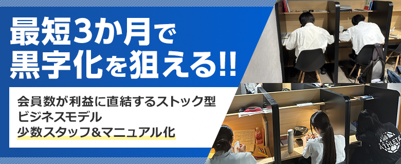 損益分岐の目安は会員32名で黒字化(※家賃・席数・営業時間・スタッフ配置により変動)としており、開校から僅か3ヶ月で黒字化を狙える設計になっています!